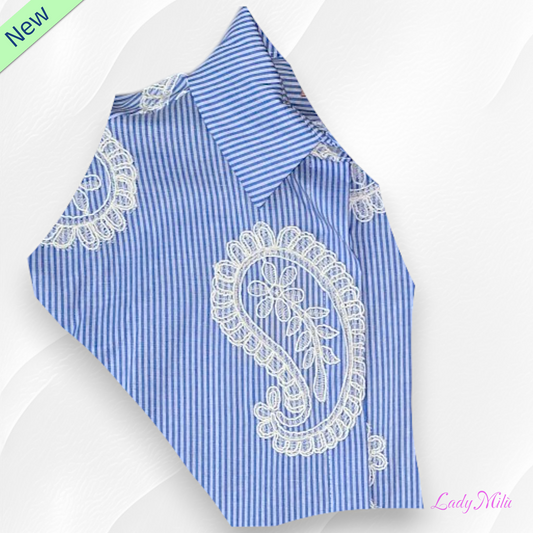 Camicia millerighe azzurra con ricami ecrù