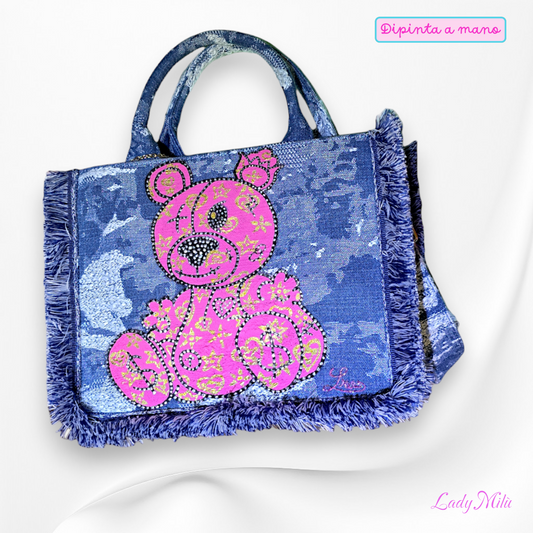 In offertaBorsa jeans con orsetto dipinta a mano